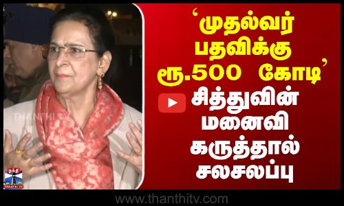 முதல்வர் பதவிக்கு 500 கோடி ரூபாய் கொடுக்க வேண்டும் - அந்தப் பணம் தங்களிடம் இல்லை என சித்துவின் மனைவியும், முன்னாள் எம்.எல்.ஏ.வுமான நவ்ஜோத் கவுர் தெரிவித்துள்ளது சலசலப்பை ஏற்படுத்தியுள்ளது. காங்கிரஸ் மூத்த தலைவரும், முன்னாள் கிரிக்கெட் வீரருமான நவ்ஜோத் சித்துவின் மனைவியான நவ்ஜோத் கவுர், பஞ்சாப் மாநிலத்தில் சட்டம்-ஒழுங்கு உள்ளிட்ட பிரச்சினைகள் குறித்து அம்மாநில ஆளுநரை சந்தித்து மனு அளித்தார். பின்னர் செய்தியாளர்களிடம் பேசிய அவர், எந்தக் கட்சியாவது சித்துவுக்கு முதல்வர் பதவி கொடுத்தால், பஞ்சாப்பை மேம்படுத்துவோம் என்று தெரிவித்தார்.