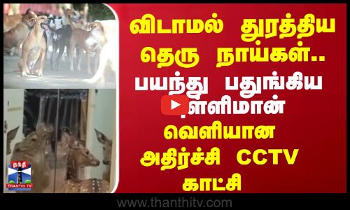 கேரள மாநிலம் வயநாடு அடுத்த சுல்தான்பத்தேரி பகுதியில் தெரு நாய்கள் துரத்திய புள்ளிமான் ஒன்று உயிருக்கு பயந்து அருகில் இருந்த துணிக்கடைக்குள் தஞ்சம் அடைந்தது. இதனால் அதிர்ச்சி அடைந்த கடை உரிமையாளர் வனத்துறையினருக்கு தகவல் அளித்தார். பின்னர் அங்கு வனத்துறை ஊழியர்கள் புள்ளி மானை வலை வைத்து பிடித்து சென்றனர். தற்போது, தெரு நாய்கள் புள்ளிமானை துரத்திய சிசிடிவி காட்சி வெளியாகியுள்ளது.