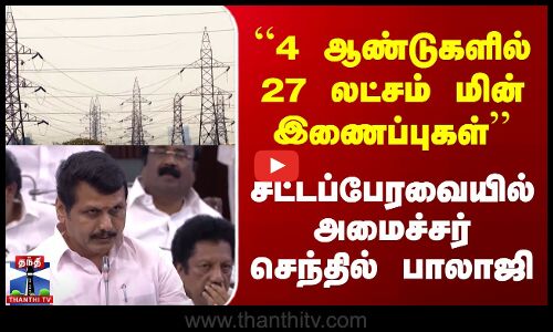 4 ஆண்டுகளில், 27 லட்சத்து 76 ஆயிரம் மின் இணைப்புகள் வழங்கப்பட்டுள்ளதாக சட்டப்பேரவையில் அமைச்சர் செந்தில் பாலாஜி தெரிவித்துள்ளார்...வளர்ச்சியை நோக்கி தமிழ்நாடும், மின் துறையும் சாதனை படைத்து வருவதாக பெருமிதம் தெரிவித்த அமைச்சர்,