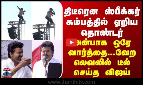 திடீரென ஸ்பீக்கர் கம்பத்தில் ஏறிய தொண்டர்...அன்பாக ஒரே வார்த்தை... வேற லெவலில் டீல் செய்த விஜய்