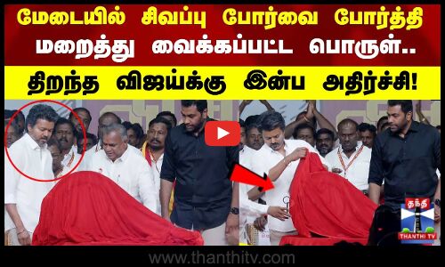 TVK |மேடையில் சிவப்பு போர்வை போர்த்தி மறைத்து வைக்கப்பட்ட பொருள்.. திறந்த விஜய்க்கு இன்ப அதிர்ச்சி