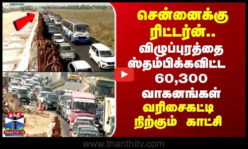 பொங்கல் விடுமுறை முடிந்து சென்னை நோக்கி வாகனங்கள் படையெடுத்து வருகின்றன. விழுப்புரத்தை கடந்து இதுவரை 60 ஆயிரத்து 300 வாகனங்கள் சென்னை நோக்கி வந்துள்ளன. விழுப்புரம் பொங்கல் பண்டிகை முடிந்து தென் மாவட்டங்களுக்கு சென்ற சென்னை வாசிகள் மீண்டும் தொடர் விடுமுறை முடிந்த சென்னை நோக்கி படையெடுத்து வருகின்றனர். விழுப்புரம் அடுத்த அய்யன் கோவில் பட்டு பகுதியில் கடுமையான போக்குவரத்து பாதிப்பு.