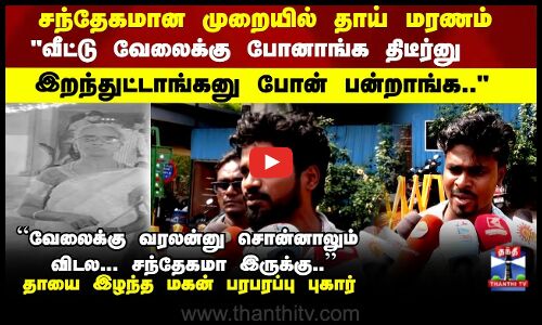 சந்தேகமான முறையில் தாய் மரணம் "வீட்டு வேலைக்கு போனாங்க திடீர்னு இறந்துட்டாங்கனு போன் பன்றாங்க.." வேலைக்கு வரலன்னு சொன்னாலும் விடல... எனக்கு சந்தேகமா இருக்கு" தாயை இழந்த மகன் பரபரப்பு புகார்