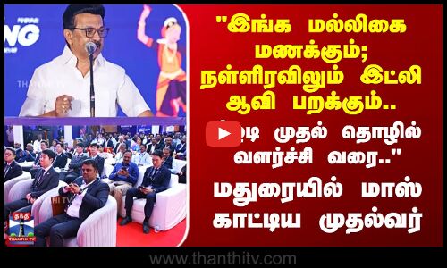 "தமிழ்நாடு வளர்கிறது" முதலீட்டாளர்கள் மாநாடு - 2025 மதுரையை தொடங்கி வைத்து உரையாற்றி முதலமைச்சர் ஸ்டாலின், மதுரை கோயில் நகரமாக மட்டுமல்லாமல், தொழில் நகரமாகவும் மாற வேண்டும் என தெரிவித்துள்ளார்...