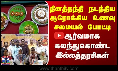 திருச்சியில் தினத்தந்தி சார்பில் இல்லத்தரசிகளுக்கான ஆரோக்கிய உணவுகள் சமையல் போட்டி நடைபெற்றது. 47 பெண்கள் கலந்து கொண்டு, விதவிதமான சிறுதானிய உணவுகளை தயாரித்து அசத்தினர். இதில் ஆரோக்கியத்தை முன்னிறுத்தி தனித்துவமாக சமைத்த கவுசல்யா, பாத்திமா, மற்றும் ரேஷ்மா ஆகியோர் முதல் மூன்று பரிசுகளை வென்றனர்.