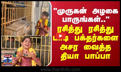 திருத்தணி சுப்பிரமணிய சுவாமி கோவிலில் முருகனின் பெருமை பேசும் பாடலை சிறுமி இறை அருட்செல்வி தியா பாடியது அனைவரையும் வெகுவாக கவர்ந்தது. சென்னை பாடியை சேர்ந்த அருட்செல்வி சிறுமி தியா திருத்தணியில் சாமி கும்பிட வந்த போது முருகன் அழகை பாருங்கள் என்ற பாடலை பாடி பக்தர்களுக்கு அழைப்பு விடுத்தார். பக்தி பரவசத்துடன் சிறுமி பாடிய பாடலை கண்டு அனைவரும் ரசித்தனர்.