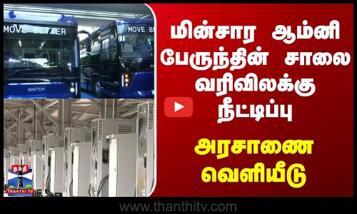 மின்சார பேருந்துகளுக்கான சாலை வரி விலக்கை மேலும் இரண்டு ஆண்டுகள் நீட்டிப்பு செய்து தமிழக அரசு அரசாணை வெளியிட்டுள்ளது. மின்சார பேருந்துகளுக்கு வழங்கப்பட்டு வந்த சாலை வரி விலக்கு புதன்கிழமையுடன் முடிவடைய உள்ள நிலையில் அதனை நீட்டிக்கவேண்டும் என பேருந்து ஆம்னி பேருந்து உரிமையாளர்கள் வலியுறுத்தி வந்த நிலையில் அரசாணை வெளியிடபட்டுள்ளது.