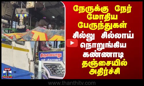 நேருக்கு நேர் மோதிய பேருந்துகள்..சில்லு சில்லாய் நொறுங்கிய கண்ணாடி-தஞ்சையில் அதிர்ச்சி