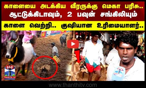 Jallikattu | ஆட்டுக்கிடாவும், 2 பவுன் சங்கிலி.. காளை வெற்றி.. குஷியான உரிமையாளர்..