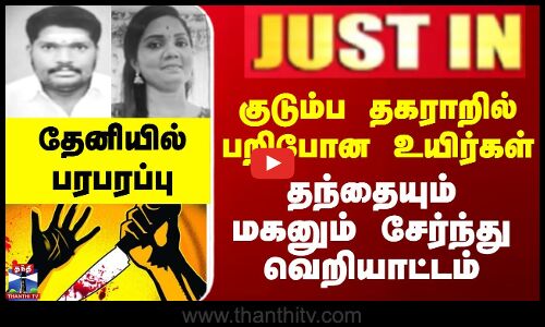 குடும்பத்தகராறில் 2 பேர் குத்திக்கொலை - தனிப்படை அமைப்பு/தேனி மாவட்டம் முத்தையன்செட்டிபட்டி பகுதியில் குடும்ப தகராறு காரணமாக தனது மனைவி மற்றும் மைத்துனரை குத்திக்கொலை செய்த இளைஞர்/3 மாதங்களுக்கு முன் திருமணம் முடிந்த தம்பதி பிரதீப்-நிகிலா இடையே தகராறு/நிகிலாவிற்கு ஆதரவாக பேச சென்றபோது கத்தியால் குத்தி கொலை செய்யப்பட்ட மைத்துனர் விவேக்/உடனிருந்த நிகிலாவையும் கத்தியால் குத்திக்கொலை செய்ததால் பரபரப்பு/2 பேரையும் கொலை செய்துவிட்டு தப்பியோடிய கணவன் பிரதீப், மாமனார் சிவகுமாரை தேடும் பணிகள் தீவிரம்/3 தனிப்படைகள் அமைத்து, 2 பேரையும் தேடும் பணிகள் தீவிர