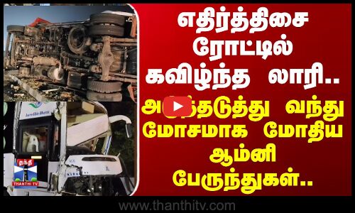 எதிர்த்திசை ரோட்டில் கவிழ்ந்த லாரி.. அடுத்தடுத்து வந்து மோசமாக மோதிய ஆம்னி பேருந்துகள்..