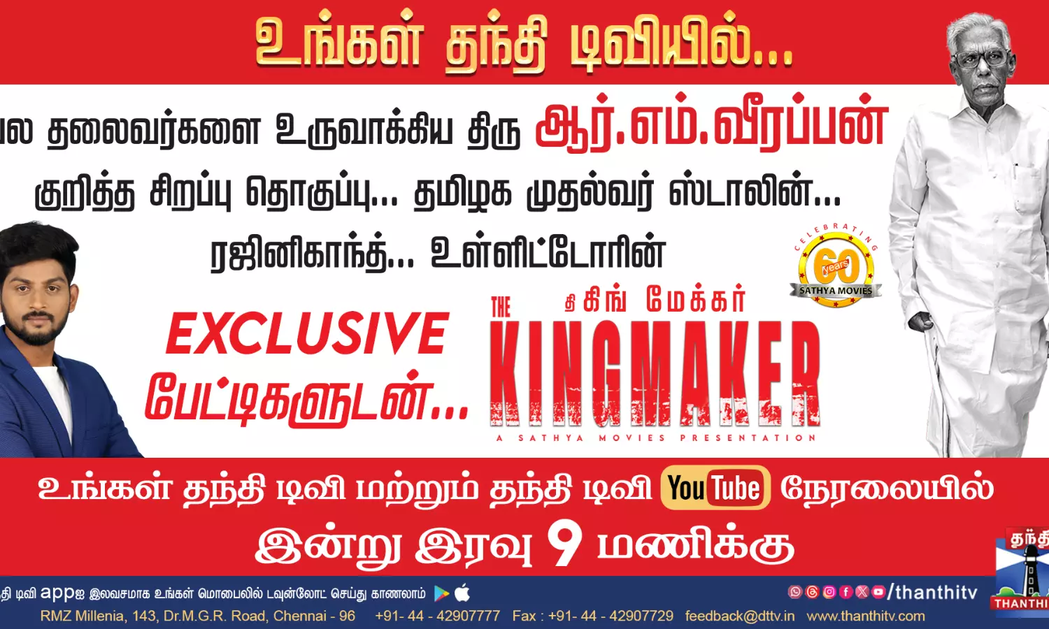 பல தலைவர்களை உருவாக்கிய திரு ஆர்.எம்.வீரப்பன் குறித்த சிறப்பு தொகுப்பு... உங்கள் தந்தி டிவியில் இன்று இரவு 9 மணிக்கு..