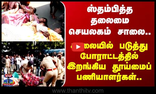 ஸ்தம்பித்த தலைமை செயலகம் சாலை.. தூய்மைப் பணியாளர்கள் போராட்டம்! வலியுறுத்தி போராட்டத்தில் ஈடுபட்டுள்ள தூய்மை பணியாளர்கள், சென்னையில் தலைமைச் செயலகம் முன்பு தூய்மைப் பணியாளர்கள் சாலை மறியல் போராட்டத்தில் ஈடுபட்டுள்ளனர்.