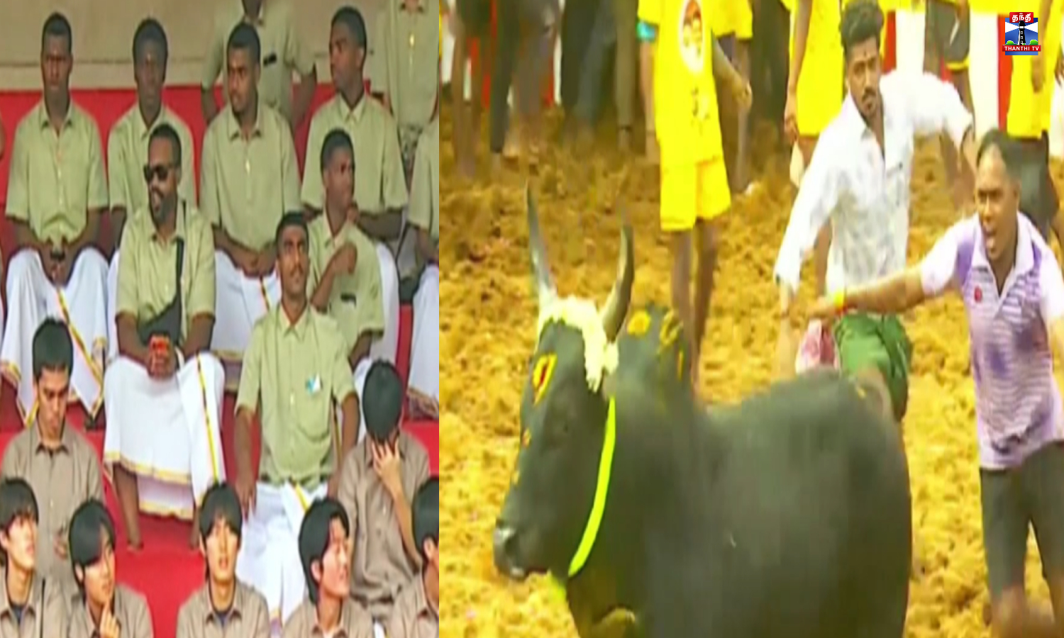 ஹாக்கி வீரர்கள் நமது தமிழர் பாரம்பரிய உடையான வேட்டி சட்டையை அணிந்து ஜல்லிக்கட்டு போட்டியை காண்பதற்காக வருகை தந்துள்ளனர்.