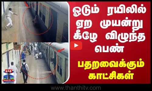 சென்னை அருகே தாம்பரத்தில் ஓடும் ரயிலில் ஏற முயன்று கீழே விழுந்த பெண்ணை, டிக்கெட் பரிசோதகர் காப்பாற்றினார். இது தொடர்பான பதறவைக்கும் சிசிடிவி காட்சிகளை காண்போம்,
