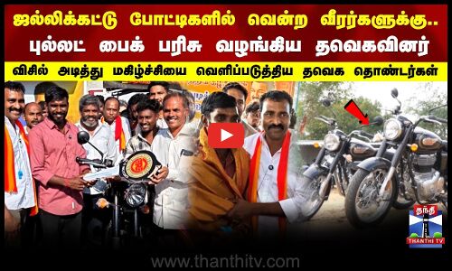 ஜல்லிக்கட்டு போட்டிகளில் வென்ற வீரர்களுக்கு, புல்லட் பைக் பரிசு வழங்கிய தவெகவினர்