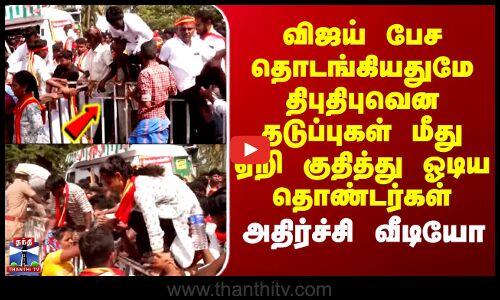 TVK Vijay | விஜய் பேச தொடங்கியதுமே திபுதிபுவென தடுப்புகள் மீது ஏறி குதித்த தொண்டர்கள்