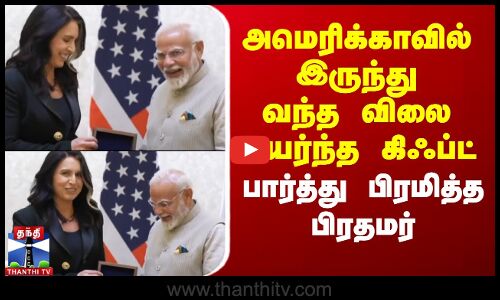 அப்போது இருவரும் கைகுலுக்கி பரஸ்பர நலம் விசாரித்து கொண்டனர். இதனை தொடர்ந்து மகா கும்பமேளாவின் புனிதநீர் அடங்கிய குவளையை பிரதமர் அவருக்கு பரிசளித்தார். அதேபோல் துளசி கப்பார்ட்டும் விலையுர்ந்த மணியை பிரதமர் மோடிக்கு பரிசாக வழங்கினார்.