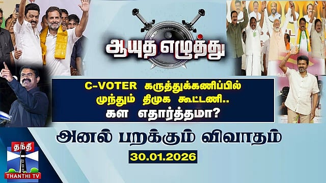 Ayutha Ezhuthu | ஆயுத எழுத்து | C-VOTER கருத்துக்கணிப்பில் முந்தும் திமுக கூட்டணி.. கள எதார்த்தமா?