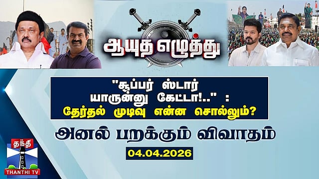 ஆயுத எழுத்து| "சூப்பர் ஸ்டார் யாருன்னு கேட்டா!.." : தேர்தல் முடிவு என்ன சொல்லும்? (04.04.2026) #ayuthaezhuthu #Debate #TNElection #Election2026 #AssemblyElections2026 #AIADMK #Menifesto #EdappadiPalaniswamy #DMK #NTK #TVK #BJP #PMK #VCK #CMStalin #EPS #Seeman #TVKVijay #TNPOLITICS #ThanthiTV