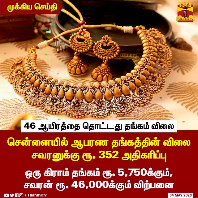 • புதிய உச்சமாக தங்கம் விலை ரூ. 46,000-ஐ தொட்டது • சென்னையில் ஆபரண தங்கத்தின் விலை சவரனுக்கு ரூ. 352 அதிகரிப்பு • ஒரு கிராம் தங்கம் ரூ. 5,750க்கும்,சவரன் ரூ. 46,000க்கும் விற்பனை • கடந்த 2 நாட்களில் மட்டும் தங்கம் விலை 1,080 ரூபாய் அதிகரிப்பு