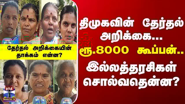 Thanthi TV Street Interview | Makkal Kural | திமுகவின் தேர்தல் அறிக்கை... ரூ.8000 கூப்பன்.. இல்லத்தரசிகள் சொல்வதென்ன? #streetinterview #makkalkural #dmk #dmkmanifesto #mkstalin #thanthitv ரூ.8000 கூப்பன் பற்றி இல்லத்தரசிகள் சொல்வதென்ன? திமுக தேர்தல் அறிக்கை ஏற்படுத்திய தாக்கம் என்ன? வீட்டு உபயோகப் பொருட்கள் வாங்க இல்லத்தரசிகளுக்கு 8 ஆயிரம் ரூபாய் கூப்பன் வழங்கப்படும் என்ற திமுகவின் தேர்தல் வாக்குறுதி குறித்து மக்கள் குரல் பகுதியில், பல்வேறு பகுதி பெண்கள் தெரிவித்த கருத்துக்களைப் பார்க்கலாம்...