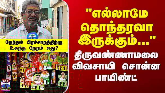 Thanthi TV Street Interview | Makkal Kural | "எல்லாமே தொந்தரவா இருக்கும்..." - விவசாயி சொன்ன பாயிண்ட் தேர்தல் பிரச்சாரத்திற்கு உகந்த நேரம் எது? பிரச்சாரத்திற்கு நேரக்கட்டுப்பாடு வேண்டுமா? தேர்தலில் வாக்காளர்களை தேடி வேட்பாளர்கள் பிரச்சாரம் செய்ய உகந்த நேரம் எது என்றும், பிரச்சாரங்களுக்கு நேரக்கட்டுப்பாடு வேண்டுமா என்றும் மக்கள் குரல் பகுதியில் எழுப்பப்பட்ட கேள்விகளுக்கு, திருவண்ணாமலை மாவட்டம் கீழ்பெண்ணாத்தூர் மக்கள் தெரிவித்த கருத்துக்களைப் பார்க்கலாம்...