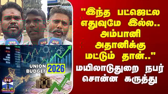 "இந்த பட்ஜெட்ல எதுவுமே இல்ல.. அம்பானி அதானிக்கு மட்டும் தான்.." - மயிலாடுதுறை நபர் சொன்ன கருத்து # நிதியமைச்சர் நிர்மலா சீதாராமன் தாக்கல் செய்துள்ள மத்திய பட்ஜெட்டில் இடம் பெற்றுள்ள அறிவிப்புகள் குறித்து மக்கள் குரல் பகுதியில் எழுப்பப்பட்ட கேள்விகளுக்கு, மயிலாடுதுறை மக்கள் தெரிவித்த கருத்துக்களைப் பார்க்கலாம்...