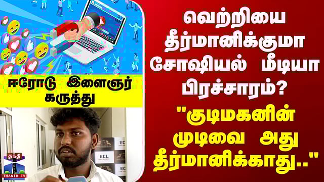 #ThanthiStreetInterviews | #SocailMedia | #Campaign | #ThanthiTV Street Interview | வெற்றியை தீர்மானிக்குமா சோஷியல் மீடியா பிரச்சாரம்? - "குடிமகனின் முடிவை இணையதளம் தீர்மானிக்காது.." - ஈரோடு இளைஞர் கருத்து முன்பு இல்லாத அளவிற்கு அரசியலில் சமூக வலைதளங்கள் ஆதிக்கம் செலுத்தி வரும் நிலையில், அவற்றின் வழியாக மேற்கொள்ளப்படும் பிரச்சாரங்கள், வெற்றிக்கு உதவுமா என்று மக்கள் குரல் பகுதியில் எழுப்பப்பட்ட கேள்விகளுக்கு, ஈரோடு மக்கள் தெரிவித்த கருத்துக்களைப் பார்க்கலாம்...