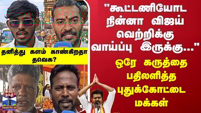 Thanthi TV Street Interview | TVK Vijay | Makkal Kural | "கூட்டணியோட நின்னா விஜய் வெற்றிக்கு வாய்ப்பு இருக்கு" புதுக்கோட்டை மக்கள் கருத்து #streetinterview #makkalkural #tvk #tvkvijay #vijay #thanthitv தனித்து களம் காண்கிறதா தவெக? கூட்டணி கட்சிகள் சேர வாய்ப்பு உள்ளதா? தனியாக நின்று வெற்றி பெறும் பெரும்படை தவெக என அக்கட்சியின் தலைவர் விஜய் பேசியிருப்பது குறித்து, மக்கள் குரல் பகுதியில் எழுப்பப்பட்ட கேள்விகளுக்கு, புதுக்கோட்டை மாவட்டம் அறந்தாங்கி மக்கள் தெரிவித்த கருத்துக்களைப் பார்க்கலாம்
