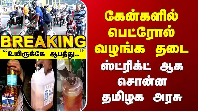 பாட்டில், கேன்களில் பெட்ரோல் வழங்க தடை அங்கீகரிக்கப்படாத பிளாஸ்டிக் கேன்கள், பாட்டில்களில் பெட்ரோல் வழங்குவதற்கு தடை விதிப்பு/பெட்ரோல் பங்க் உரிமையாளர்களுக்கு தமிழக அரசு கடும் எச்சரிக்கை/எரிபொருளை பதுக்கினால் சிறை - கள்ளச்சந்தை விற்பனையைத் தடுக்கத் தனிப்படை அமைப்பு/“கேன்களில் பெட்ரோல் நிரப்பினால் உயிருக்கு ஆபத்து ஏற்படும்“/பெட்ரோல் எளிதில் தீப்பற்றக்கூடியது, வீடுகளில் சேமிக்காதீர் - தமிழக அரசு நேரடியாக டேங்குகளில் மட்டுமே எரிபொருள் நிரப்ப வேண்டும் - தமிழக அரசு ஜெனரேட்டர், உழவு இயந்திரங்கள் ஆகியவற்றுக்கு மட்டுமே எரிபொருள் கேன்களில் வழங்க அனுமதி/எண்ணெய் நிறுவனங்களுடன் இணைந்து விநியோகத்தை உறுதி செய்துவரும் தமிழக அரசு/வழிகாட்டுதல்களை மீறினால் கடுமையான நடவடிக்கை எடுக்கப்படும் - தமிழக அரசு எச்சரிக்கை