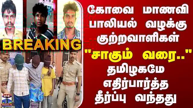 BREAKING || கோவை மாணவி பாலியல் வன்கொடுமை வழக்கு - "சாகும் வரை.." வெளியான தண்டனை விவரம் கோவை மாணவி பாலியல் வன்கொடுமை வழக்கு - தண்டனை விவரம்/கோவை மாணவி கூட்டு பாலியல் வன்கொடுமை வழக்கில் குற்றவாளிகள் 3 பேருக்கும் தண்டனை அறிவிக்கப்படுகிறது/3 பேருக்கான தண்டனை விவரங்களை அறிவிக்கிறார் கோவை மகளிர் நீதிமன்ற நீதிபதி சுந்தரராஜ்//