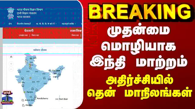 BREAKING || இந்திய வானிலை மைய இணையத்தில் முதன்மை மொழியாக இந்தி மாற்றம் இந்திய வானிலை மைய இணையத்தில் முதன்மை மொழியாக இந்தி இந்திய வானிலை ஆய்வு மையத்தின் இணையதளம் முதன்மை மொழியாக ஹிந்தி மொழிக்கு மாறியுள்ளது. முன்பு இணையதளம் உள்ளே செல்லும் போது ஆங்கிலத்தில் இருக்கும். பின் ஹிந்தி மொழி வேண்டுவோர் உள்ளே சென்று மாற்றிக்கொள்ள வேண்டும். தற்போது முதன்மை மொழியாக ஹிந்தி உள்ளது. ஹிந்தி மொழி அறியாதவர்கள் உள்ளே சென்ற பின் ஆங்கில இணையதளம் மாற்றிக்கொள்ளும் படி இணையதளத்தின் மொழி மாற்றப்பட்டுள்ளது