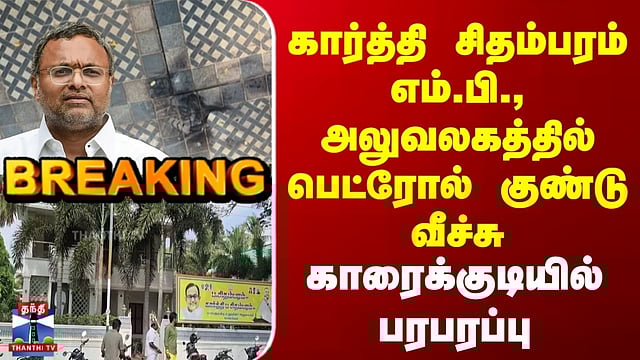 கார்த்தி சிதம்பரம் எம்.பி., அலுவலகத்தில் பெட்ரோல் குண்டு வீச்சு சிவகங்கை மாவட்டம் காரைக்குடியில் உள்ள கார்த்தி சிதம்பரம் எம்.பி., அலுவலகத்தில் பெட்ரோல் குண்டு வீச்சு/இரவில் பெட்ரோல் குண்டு வீசிவிட்டு சிசிடிவி கேமராவை உடைத்து சென்ற மர்ம கும்பல்/காரைக்குடி போலீசார் பெட்ரோல் குண்டு வீச்சு குறித்து விசாரணை