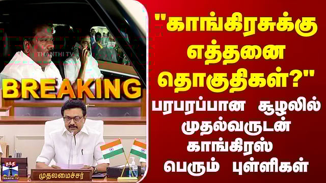 Congress | DMK | CM Stalin | "காங்கிரசுக்கு எத்தனை தொகுதிகள்?" - முதல்வருடன் காங். பெரும் புள்ளிகள் #congress #dmk #cmstalin #mkstalin #selvaperunthagai #kcvenugopal #thanthitv காங். பொது செயலாளர் கே.சி.வேணுகோபால் சென்னை வருகை முதலமைச்சர் ஸ்டாலினை சந்திக்க காங்கிரஸ் பொதுச்செயலாளர் கே.சி.வேணுகோபால் சென்னை வருகை அண்ணா அறிவாலயத்தில் முதலமைச்சர் ஸ்டாலினை சந்திக்கிறார் கே.சி.வேணுகோபால் திமுக-காங்கிரஸ் இடையே தொகுதி பங்கீடு குறித்து ஆலோசனை நடத்த உள்ளார்