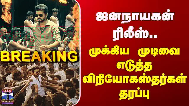 Breaking | Jananayagan | ஜனநாயகன் ரிலீஸ்.. | முக்கிய முடிவை எடுத்த விநியோகஸ்தர்கள் தரப்பு #tvkvijay #jananayagan #Actorvijay #vijay #thanthitv ஜனநாயகன் படம் - விநியோகஸ்தர்கள் புது முடிவு ஜனநாயகன் திரைப்படத்தை வெளியிட விநியோகஸ்தர்கள் தரப்பு ஒத்துழைப்பு தர முடிவு/தயாரிப்பாளர் தரப்பில் விநியோகஸ்தர்களுடன் பேச்சுவார்த்தை நடந்தது/ஜனநாயகன் படத்தை எவ்வளவு சீக்கிரம் வெளியிட முடியும் - விநியோகஸ்தர்கள் தரப்பு/நாளை தயாரிப்பு நிறுவனம் தரப்பில் மும்பை சென்று சென்சார் போர்டு அதிகாரிகளை சந்திக்க உள்ளனர்/ஜனநாயகன் திரைப்படத்தை தேர்தலுக்குப் பிறகுதான் திரையிடுவோம் என கடிதம் கொடுக்கப்பட உள்ளதாக தகவல்/நாளை ஓடிடி நிறுவனத்துடன் தயாரிப்பாளர் தரப்பில் பேச்சுவார்த்தை நடைபெற உள்ளது