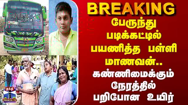 பேருந்து படிக்கட்டில் பயணித்த பள்ளி மாணவன்.. பறிபோன உயிர் #death #students #bus #accident #school #pudukkottai #police #thanthitv பேருந்தில் இருந்து தவறி விழுந்து 10-ம் வகுப்பு மாணவன் பலி புதுக்கோட்டை மாவட்டம் ஆலங்குடி அருகே பேருந்தில் இருந்து தவறி விழுந்து பள்ளி மாணவன் உயிரிழந்த சம்பவம் சோகத்தை ஏற்படுத்தி உள்ளது...