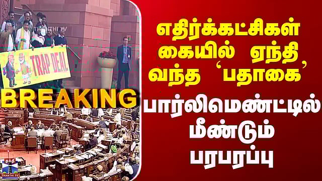 Parliament Session | எதிர்க்கட்சிகள் கையில் ஏந்தி வந்த `பதாகை’ - பார்லிமெண்ட்டில் மீண்டும் பரபரப்பு #parliament #oppositionparties #moditrump #thanthitv மக்களவை 11 மணிக்கு தொடங்கிய உடனே எதிர்கட்சிகள் முழக்கம். பதாகைகளை ஏந்தி அவை மைய பகுதிக்குச் சென்று முழக்கம் அமளி காரணமாக மக்களவை 12 மணி வரை ஒத்திவைப்பு. எதிர்க்கட்சி நாடாளுமன்ற உறுப்பினர்கள் நாடாளுமன்ற வளாகத்தில் போராட்டத்தில் ஈடுபட்டுள்ளனர்