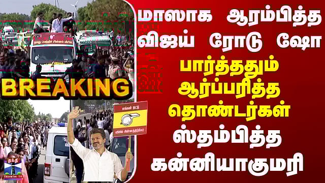 Kanyakumari | TVK Vijay | மாஸாக ஆரம்பித்த விஜய் ரோடு ஷோ - பார்த்ததும் ஆர்ப்பரித்த தொண்டர்கள் #kanniyakumari #tvkvijay #vijay #tvk #tnelection2026 #electioncommission #tnelection #election2026 #electionswiththanthitv #thanthitv #therthalthiruvizha ரோடுஷோ நிகழ்ச்சிக்காக சென்றுள்ள த.வெ.க தலைவர் விஜய், கன்னியாகுமரியை அடைந்துள்ளார். அவருக்கு தொண்டர்கள் உற்சாக வரவேற்பு அளித்து வரும் காட்சிகளை பார்க்கலாம்.... இது குறித்த கூடுதல் தகவலை செய்தியாளர் ராமசுந்தரம் வழங்கிட கேட்கலாம்...