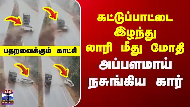 ஆந்திரா மாநிலம் ஸ்ரீகாகுளம் அருகே மழையால் ஓட்டுநரின் கட்டுப்பாட்டை இழந்த கார் தடுப்பை தாண்டி சாலையின் எதிர் திசையில் வந்த லாரி மீது நேருக்குநேர் மோதி விபத்தின் பதறவைக்கும் காட்சிகள் வெளியாகி உள்ளது... நெடுஞ்சாலையில் வழுக்கிச்சென்ற கார் - எதிர் திசையில் வந்த லாரியில் மோதி விபத்து - பதறவைக்கும் காட்சிகள் ஆந்திர மாநிலம் ஸ்ரீகாகுளம் அருகே தேசிய நெடுஞ்சாலையில் நிகழ்ந்த பயங்கர விபத்து பெரும் பரபரப்பை ஏற்படுத்தியுள்ளது. ஒடிசாவைச் சேர்ந்த 3 பக்தர்கள், பூரி ஜெகந்நாதர் கோவிலில் சாமி தரிசனம் முடித்துவிட்டு இன்னோவா காரில் ஊர் திரும்பிக் கொண்டிருந்தனர். அப்போது பெய்த பலத்த மழையால், கட்டுப்பாட்டை இழந்த கார் சாலையில் வழுக்கிச்சென்று, நடுவே இருந்த தடுப்புச் சுவரைத் தாண்டி, எதிர் திசையில் வந்த லாரி மீது நேருக்கு நேர் மோதியது. இதில் கார் அப்பளம் போல் நொறுங்கிய நிலையில், அச்சுதானந்தா மற்றும் முகேஷ் ஆகியோர் படுகாயமடைந்தனர். இருவரும் உயிருக்கு ஆபத்தான நிலையில் மருத்துவமனையில் அனுமதிக்கப்பட்டுள்ளனர். மழையினால் சாலை வழுக்கியதே இந்த கோர விபத்துக்குக் காரணம் எனத் முதற்கட்ட விசாரணையில் தெரியவந்துள்ள நிலையில் இந்த விபத்தின் பதறவைக்கும் சிசிடிவி காட்சிகள் வெளியாகியுள்ளது.