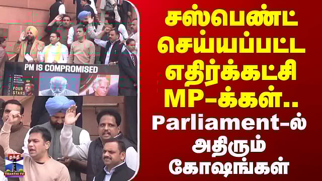 மக்களவையில் இருந்து சஸ்பெண்ட் செய்யப்பட்ட எதிர்க்கட்சி எம்.பி.க்கள் நாடாளுமன்ற வளாகத்தில் போராட்டத்தில் ஈடுபட்டு வருகின்றனர்... அதனை காணலாம்...