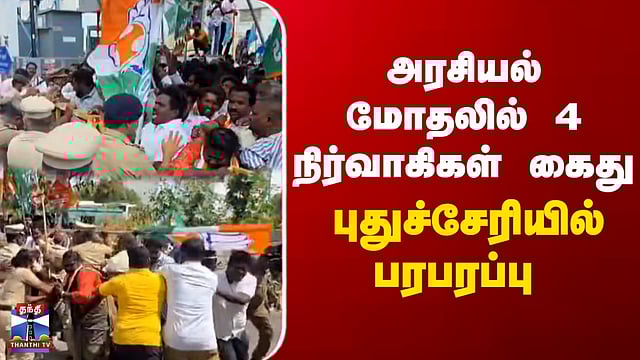 புதுச்சேரியில் அரசியல் மோதல் - 4 காங்கிரஸ் நிர்வாகிகள் கைது புதுச்சேரியில் பாஜக - காங்கிரஸ் கட்சியினரிடையே ஏற்பட்ட மோதல் தொடர்பாக, காங்கிரஸ் நிர்வாகிகள் 4 பேரை போலீசார் கைது செய்தனர். டெல்லியில் நடைபெற்ற ஏஐ மாநாட்டில் காங்கிரஸ் கட்சியினர் போராட்டம் நடத்தியதற்கு எதிர்ப்பு தெரிவித்து, புதுச்சேரியில் பாஜகவினர் ராகுல் காந்தியின் உருவ பொம்மையை எரித்தனர். பதிலுக்கு காங்கிரஸ் கட்சியினர், பாஜக அலுவலகம் நோக்கி சென்றதுடன் பிரதமரின் உருவ பொம்மையை எரித்தனர். இதையடுத்து, இரு தரப்பினருக்கும் இடையே மோதல் ஏற்பட்டது. இந்த சம்பவம் தொடர்பாக, காங்கிரஸ் நிர்வாகிகளான சிலம்பரசன், சுரேந்தர் உள்ளிட்ட 4 பேரை போலீசார் கைது செய்தனர். தலைமறைவாக உள்ள இளைஞர் காங்கிரஸ் தலைவர் ஆனந்தபாபு உள்ளிட்டோரை போலீசார் தீவிரமாகத் தேடி வருகின்றனர்.