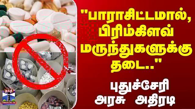 Paracetamol | Medicine | பாரசிட்டமல், பிரிம்கிளவ் மருந்துகளுக்கு புதுச்சேரி அரசு தடை புதுச்சேரியில் தரம் குறைவான மருந்துகள் விற்பனைக்கு, மாநில மருந்து கட்டுப்பாட்டு துறை, தொடர்ந்து தடை விதித்து வருகிறது. இமாசல பிரதேசம் மாநிலத்தில் உள்ள பிரைமஸ் மருந்து நிறுவனம் தயாரிக்கும் பிரிம்கிளவ் ஊசி மருந்தும், பின்னாகிள் லைப் சயின்ஸ் தயாரிக்கும் அசிடமோல்-500 என்ற பாரசிட்டமல் மாத்திரையும் தரமின்றி இருப்பதால், அவற்றை புதுச்சேரியில் விற்பனை செய்ய தடை விதிக்கப்பட்டுள்ளது. மேலும், காலாவதியான மருந்துகள் அழிப்பு விவரங்கள் மற்றும் 3ம் தரப்பு மருந்து கொள்முதல் விபரங்களை கட்டாயம், மருந்து கட்டுப்பாட்டுத் துறைக்கு சமர்ப்பிக்கவும் உத்தரவிடப்பட்டுள்ளது.
