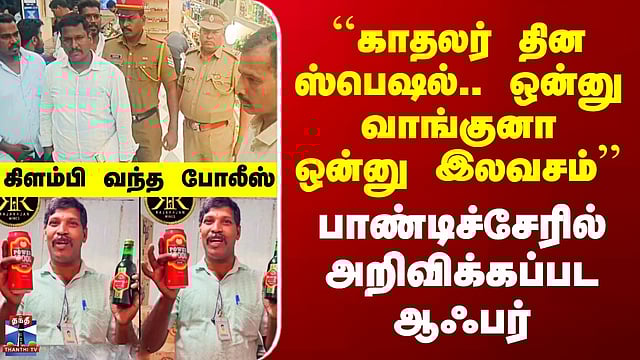 Valentine Day Offer | ``காதலர் தின ஸ்பெஷல் ஒன்னு வாங்குனா ஒன்னு இலவசம்’’ - பாண்டிச்சேரியில் பரபரப்பு #pudhucherry #valentinesday #police #offer தனியார் மதுபான கடையில் கலால் துறையினர் திடீர் ஆய்வு புதுச்சேரி அருகே காதலர் தினத்தை முன்னிட்டு விதிகளை மீறி சலுகைகளை அறிவித்த தனியார் மதுபானக் கடையில் கலால்துறையினர் திடீரென ஆய்வு மேற்கொண்டனர். அப்போது ஒன்று வாங்கினால் மற்றொன்று இலவசம் என சலுகை விலையில் மதுபானங்கள் விற்பனை செய்தது தெரியவந்தது. இது கலால் விதிகளுக்கு எதிரானது என கூறி கடை உரிமையாளர்களுக்கு எச்சரிக்கை விடுத்த அதிகாரிகள், சம்பந்தபட்ட கடைக்கு விளக்கம் கேட்டு நோட்டீஸ் வழங்கப்படும் என தெரிவித்தனர்.