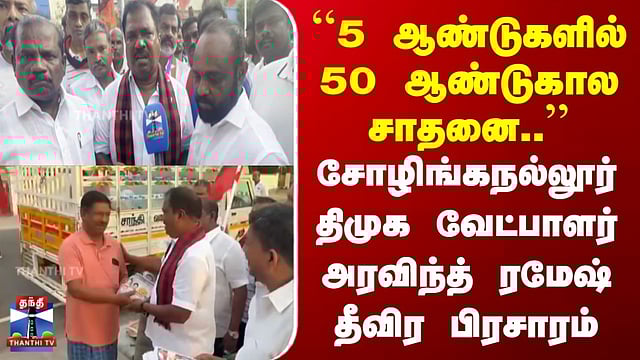 Chennai | DMK | ``5 ஆண்டுகளில் 50 ஆண்டுகால சாதனை..'' | சோழிங்கநல்லூர் திமுக வேட்பாளர் அரவிந்த் ரமேஷ் #chennai #DMK #tnelection2026 #thanthitv சோழிங்கநல்லூர் திமுக வேட்பாளர் அரவிந்த் ரமேஷ் தீவிர வாக்கு சேகரிப்பு சென்னை சோழிங்கநல்லூர் தொகுதியில் திமுக வேட்பாளராக போட்டியிடும் அரவிந்த் ரமேஷ், மடிப்பாக்கம் ஏரி பகுதியில் நடைப்பயிற்சி சென்ற பொதுமக்களிடம் தீவிர வாக்கு சேகரிப்பில் ஈடுபட்டார். அப்போது, சாலை மற்றும் பாதாள சாக்கடை வசதிகள் செய்யப்பட்டதற்காக பொதுமக்கள் அவருக்கு நன்றி தெரிவித்தனர். பின்னர் பேசிய அரவிந்த் ரமேஷ், மடிப்பாக்கம் மற்றும் சுற்றுப்புற பகுதிகளில் மழைநீர் தேக்கம் நீங்க, முதலமைச்சர் தலைமையில் தனிக்குழு அமைத்து நிரந்தர தீர்வு காணப்பட்டதாகக் கூறினார். இந்த நடவடிக்கைகளால், மழைக்காலங்களில் பாதிப்பு இல்லாத பாதுகாப்பான பகுதியாக மாற்றப்பட்டுள்ளது என்றும், கடந்த ஐந்து ஆண்டுகளில் முக்கியமான சாதனைகள் மேற்கொள்ளப்பட்டுள்ளதாகவும் அவர் தெரிவித்தார்.
