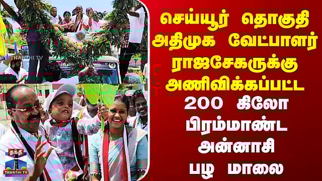 ADMK | Cheyyur | TN Election 2026 | செய்யூர் தொகுதி அதிமுக வேட்பாளர் ராஜசேகருக்கு அணிவிக்கப்பட்ட 200 கிலோ பிரம்மாண்ட அன்னாசி பழ மாலை #ADMK #cheyyur #admkcandidate #tnelection2026 #thanthitv செய்யூர் தொகுதி அதிமுக வேட்பாளர் ராஜசேகர் தீவிர தேர்தல் பிரசாரம் செங்கல்பட்டு மாவட்டம் செய்யூர் சட்டமன்றத் தொகுதி அதிமுக வேட்பாளர் ராஜசேகர், இன்று திருக்கழுக்குன்றம் ஒன்றியத்திற்கு உட்பட்ட பல்வேறு பகுதிகளில் தீவிர வாக்கு சேகரிப்பில் ஈடுபட்டார். வெங்கப்பாக்கம், ஆரம்பாக்கம், நத்தமேடு, விட்டிலாபுரம் உள்ளிட்ட பத்திற்கும் மேற்பட்ட கிராமங்களில் வீதி வீதியாகச் சென்று ஆதரவு திரட்டினார். அப்போது அவருக்குத் தேசிய ஜனநாயகக் கூட்டணிக் கட்சியினர் மற்றும் பொதுமக்கள் உற்சாக வரவேற்பு அளித்தனர். குறிப்பாக, விட்டிலாபுரம் பகுதியில் அதிமுக சார்பில் வேட்பாளர் ராஜசேகருக்கு 200 கிலோ எடை கொண்ட பிரம்மாண்ட அன்னாசி பழ மாலை அணிவிக்கப்பட்டது. பெண்கள் ஆலாத்தி எடுத்து வரவேற்ற நிலையில், வழிநெடுகிலும் திரண்டிருந்த மக்களிடம் இரட்டை இலை சின்னத்திற்கு வாக்கு சேகரித்த வேட்பாளர், தொகுதி மேம்பாட்டிற்கான வாக்குறுதிகளையும் முன்வைத்தார்.