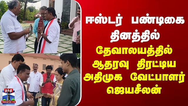 Gudalur | ADMK | TN Election 2026 | ஈஸ்டர் பண்டிகை தினத்தில் தேவாலயத்தில் ஆதரவு திரட்டிய அதிமுக வேட்பாளர் ஜெயசீலன் #Gudalur | #ADMK | #TNElection2026 | #thanthitv ஈஸ்டர் பண்டிகை - தேவாலயத்தில் ஆதரவு திரட்டிய அதிமுக வேட்பாளர் நீலகிரி மாவட்டம் கூடலூர் சட்டமன்ற தொகுதியில் அதிமுக சார்பில் போட்டியிடும் வேட்பாளர் ஜெயசீலன், ஈஸ்டர் பண்டிகை தினத்தில், தேவாலயத்திற்கு சென்று வாக்கு சேகரித்தார். தமிழகத்தில் சட்டப்பேரவை தேர்தல் களம் சூடுபிடித்துள்ள நிலையில், மாநிலம் முழுவதும் அரசியல் கட்சிகளின் வேட்பாளர்கள் சுட்டெரிக்கும் வெயிலிலும் தீவிர வாக்கு சேகரிப்பில் ஈடுபட்டு வருகின்றனர். அந்த வகையில் கூடலூர் சட்டமன்ற தொகுதியில் அதிமுக சார்பில் போட்டியிடும் வேட்பாளர் ஜெயசீலன், நாள்தோறும் வீதி, வீதியாக சென்று வாக்கு சேகரித்து வருகிறார். இந்தநிலயில் இயேசு கிறிஸ்து உயிர்த்தெழுந்த தினமான இன்று, கூடலூர் நகரின் மையப்பகுதியில் அமைந்துள்ள, செயின்ட் தாமஸ் குழந்தை இயேசு தேவாலயத்திற்கு அதிமுக வேட்பாளர் ஜெயசீலன் நேரில் சென்று வாக்கு சேகரித்தார். அப்போது தேவாலயத்திற்கு வருகை தந்த பெண்கள் மற்றும் பொதுமக்களுக்கு ஈஸ்டர் வாழ்த்துகளை கூறிய வேட்பாளர் ஜெயசீலன், துண்டு பிரசுரங்களை வழங்கி தமக்கு அதிமுக சின்னத்தில் வாக்களிக்குமாறு கேட்டுக்கொண்டார்.