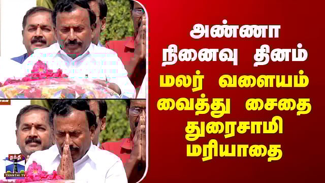 அண்ணா நினைவு தினம் - நினைவிடத்தில் மலர் வளையம் வைத்து சைதை துரைசாமி மரியாதை #SaidaiDuraisamy #AnnaMemorialDay #thanthitv அண்ணா நினைவிடத்தில் சைதை துரைசாமி மரியாதை முன்னாள் முதல்வர் அண்ணா நினைவிடத்தில், சென்னை மாநகராட்சி முன்னாள் மேயர் சைதை துரைசாமி மரியாதை செலுத்தினார். அண்ணாவின் 57வது நினைவு தினம் இன்று அனுசரிக்கப்படுகிறது. இதையொட்டி சென்னை மெரினா கடற்கரையில் உள்ள அண்ணா நினைவிடத்தில், முன்னாள் மேயர் சைதை துரைசாமி, மலர்தூவி மரியாதை செலுத்தினார்.