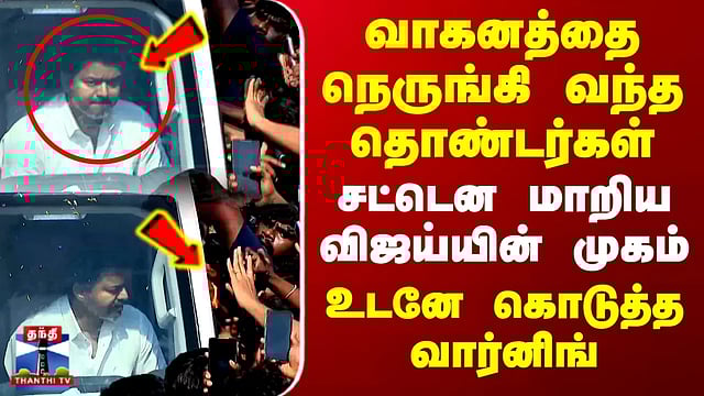 வாகனத்தை நெருங்கி வந்த தொண்டர்கள்..சட்டென மாறிய விஜய் முகம்