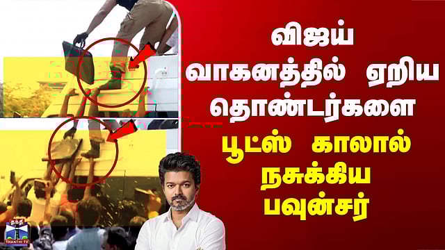 Vijay | TVK | விஜய் வாகனத்தில் ஏறிய தொண்டர்களை பூட்ஸ் காலால் நசுக்கிய பவுன்சர்